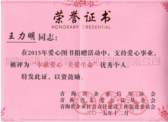 表彰大會上,為第三批“國家信用等級”企業(yè),“我誠信我光彩”主題征文活動獲獎作者, 26家“青海誠信經營示范單位”,18家“星級信用商戶”,18家“奉獻愛心、關愛生命”圖書捐贈“突出貢獻單位”,19家等頒發(fā)了牌匾、證書及獎品。我公司獲“奉獻愛心、關愛生命”圖書捐贈模范單位;公司董事長王力明獲“奉獻愛心、關愛生命”圖書捐贈優(yōu)秀個人;賀海濤同志獲“我誠信我光彩”主題征文活動“優(yōu)秀征文獎”。