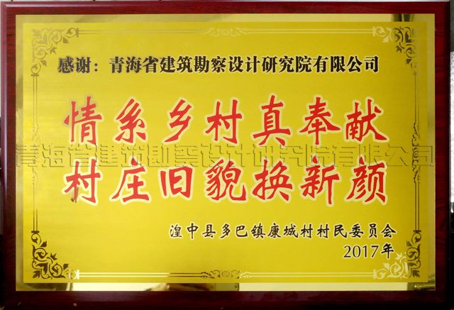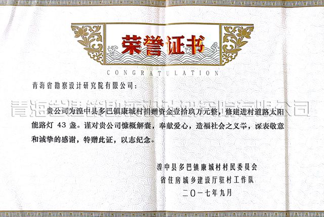 2017年10月26日,湟中縣多巴鎮(zhèn)康城村村民委員會(huì)頒給公司一塊獎(jiǎng)牌和一本榮譽(yù)證書(shū)。獎(jiǎng)牌上“情系鄉(xiāng)村真奉獻(xiàn),村莊舊貌換新顏”的十四個(gè)紅紅的大字顯得十分醒目?!百F公司為湟中縣多巴鎮(zhèn)康城村捐贈(zèng)資金壹拾玖萬(wàn)元整,修建進(jìn)村道路太陽(yáng)能路燈43盞。謹(jǐn)對(duì)貴公司慷慨解囊、奉獻(xiàn)愛(ài)心,造福社會(huì)之義舉,深表敬意和誠(chéng)摯的感謝。特贈(zèng)此證,以志紀(jì)念”,榮譽(yù)證書(shū)上暖暖的一番話,記錄了公司對(duì)聯(lián)點(diǎn)幫扶村——康城村的真幫扶和真愛(ài)心,也表達(dá)了康城村村民對(duì)公司的一片感恩之情。