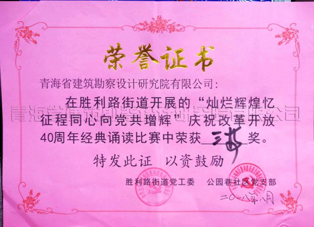 8月2日,西寧市城西區(qū)勝利路黨工委和公園巷社區(qū)黨支部在轄區(qū)聯(lián)合舉辦了“燦爛輝煌憶征程,同心向黨共曾輝”慶祝改革開(kāi)放40周年經(jīng)典誦讀比賽,我公司設(shè)計(jì)一所張麗潔代表單位參賽,她朗誦的詩(shī)歌——《憶黨史、頌黨情、跟黨走》,在本次誦讀比賽中為單位贏(yíng)得誦讀比賽三等獎(jiǎng)。特向參賽者表示祝賀。